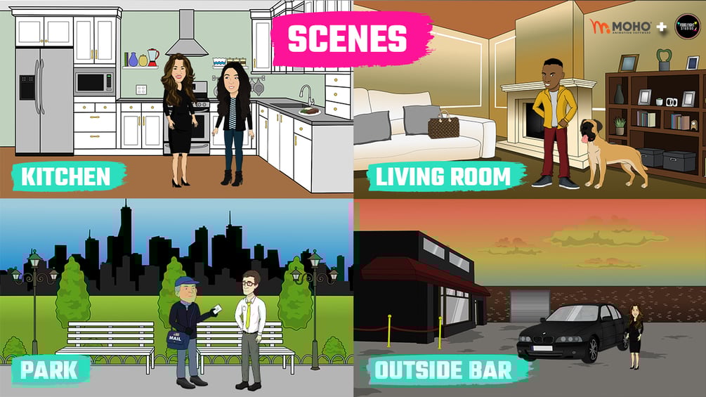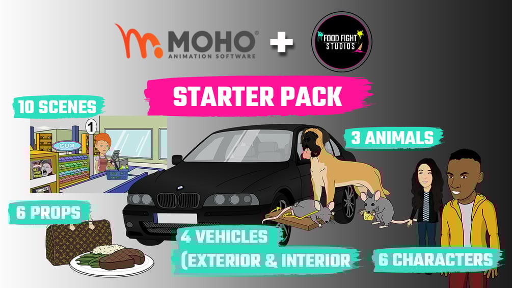 The Moho Starter Pack includes over 28 assets including animals, characters, props, scenes and vehicles that are rigged and ready to use on your next Moho animation project. Each scene has its own set of props that can be used to customize your animation.